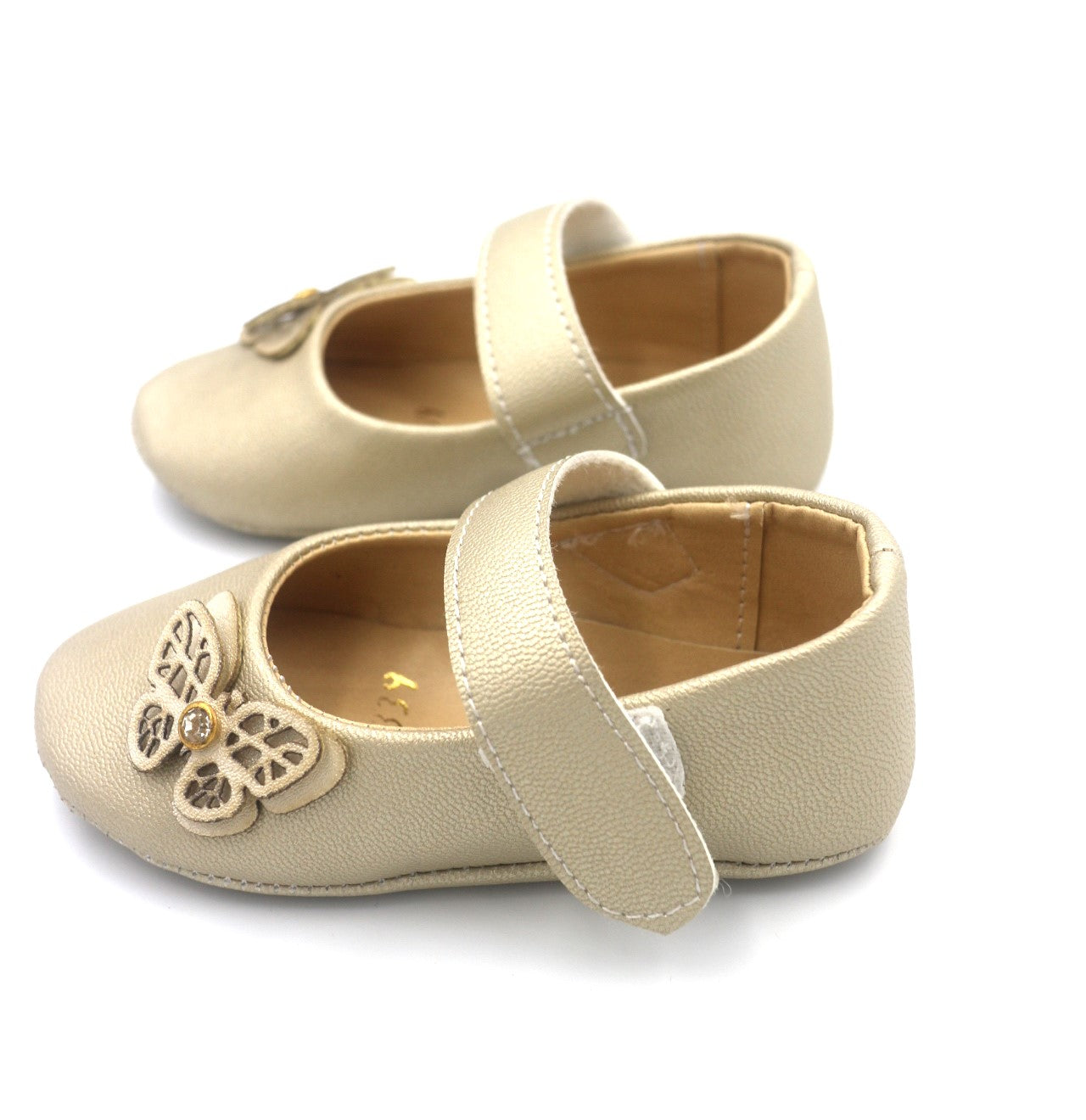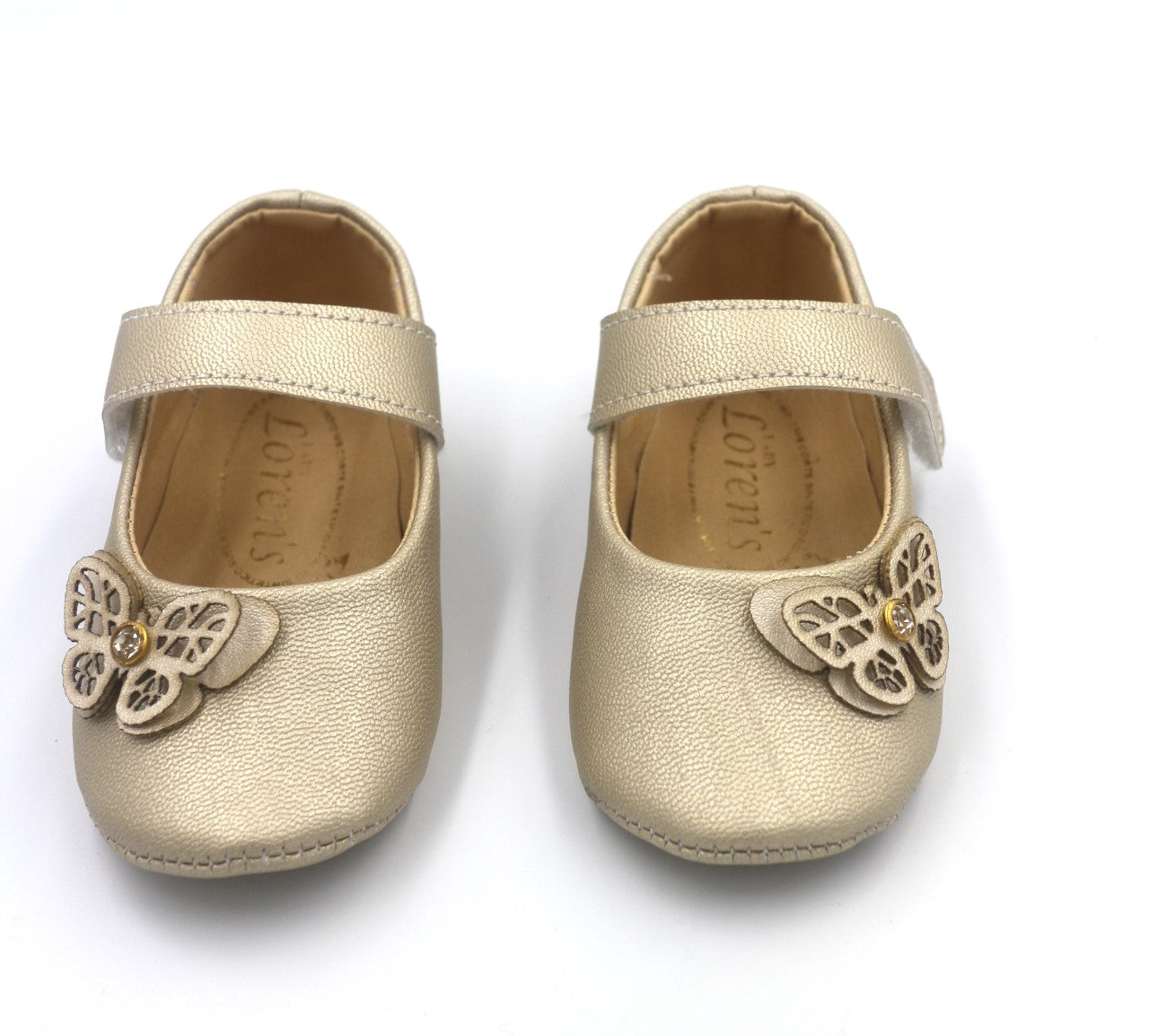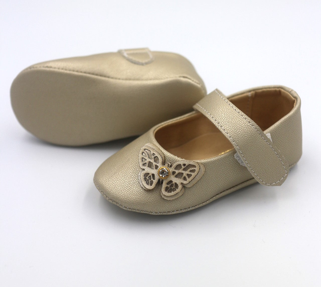 Zapatilla en tono dorado ajuste con velcro, con un detalle por un lado de una mariposa súper linda para las más pequeñas de la casa.