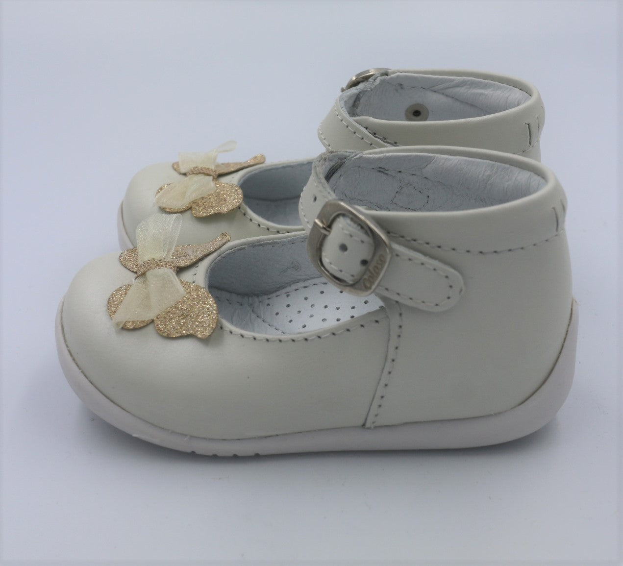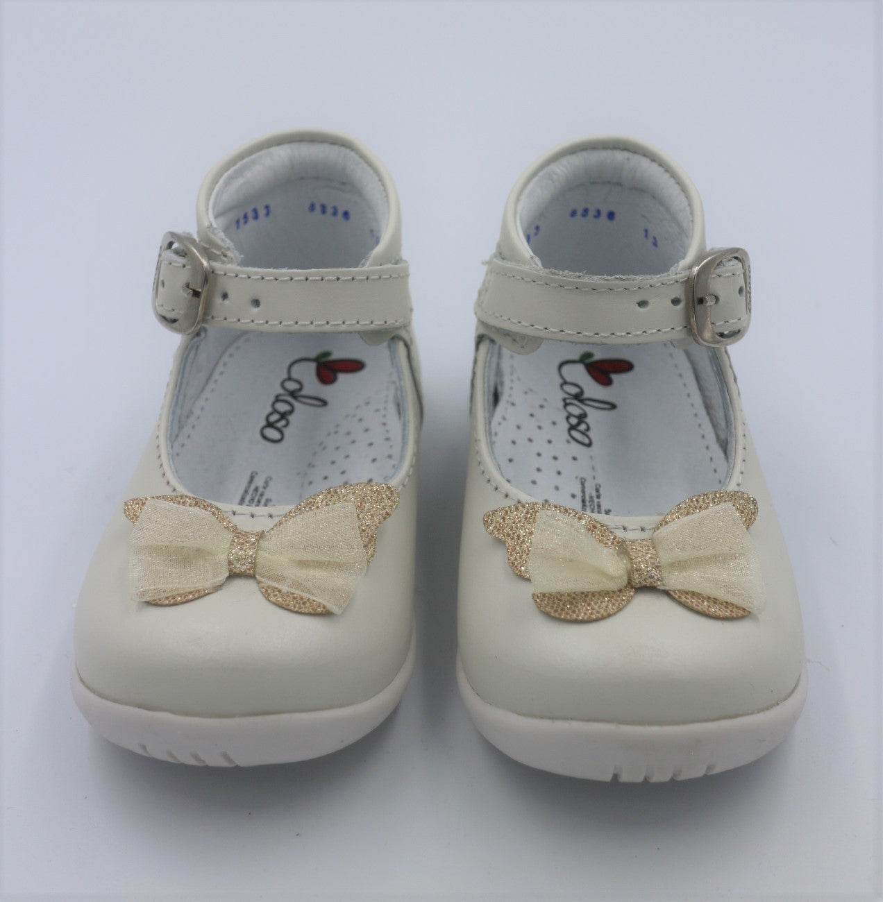Zapatito color beige nacarado con un lindo moño dorado ajuste con traba para mayor soporte.