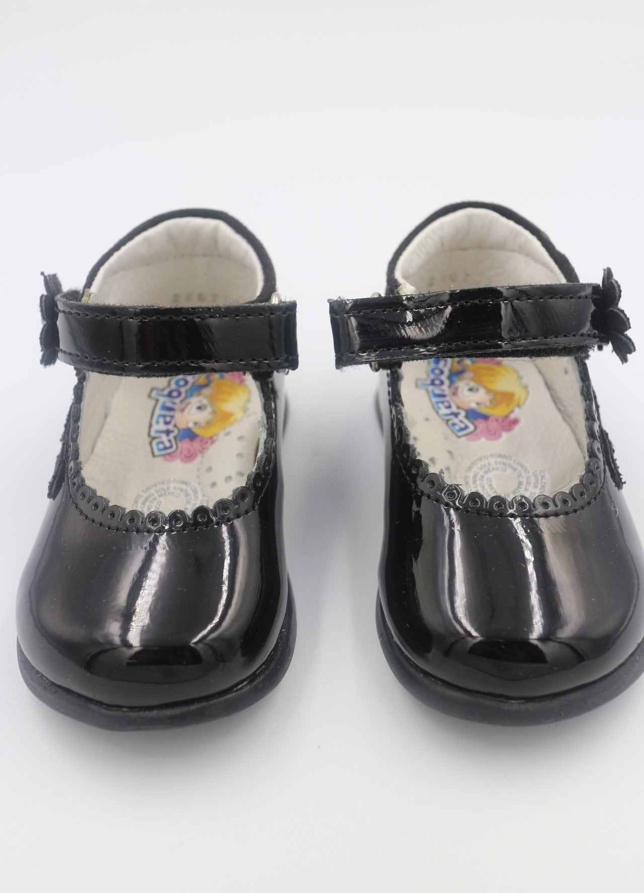 Zapatito de charol color negro ajuste con velcro con un lindo detalle de una flor ideal para cualquier ocasión.